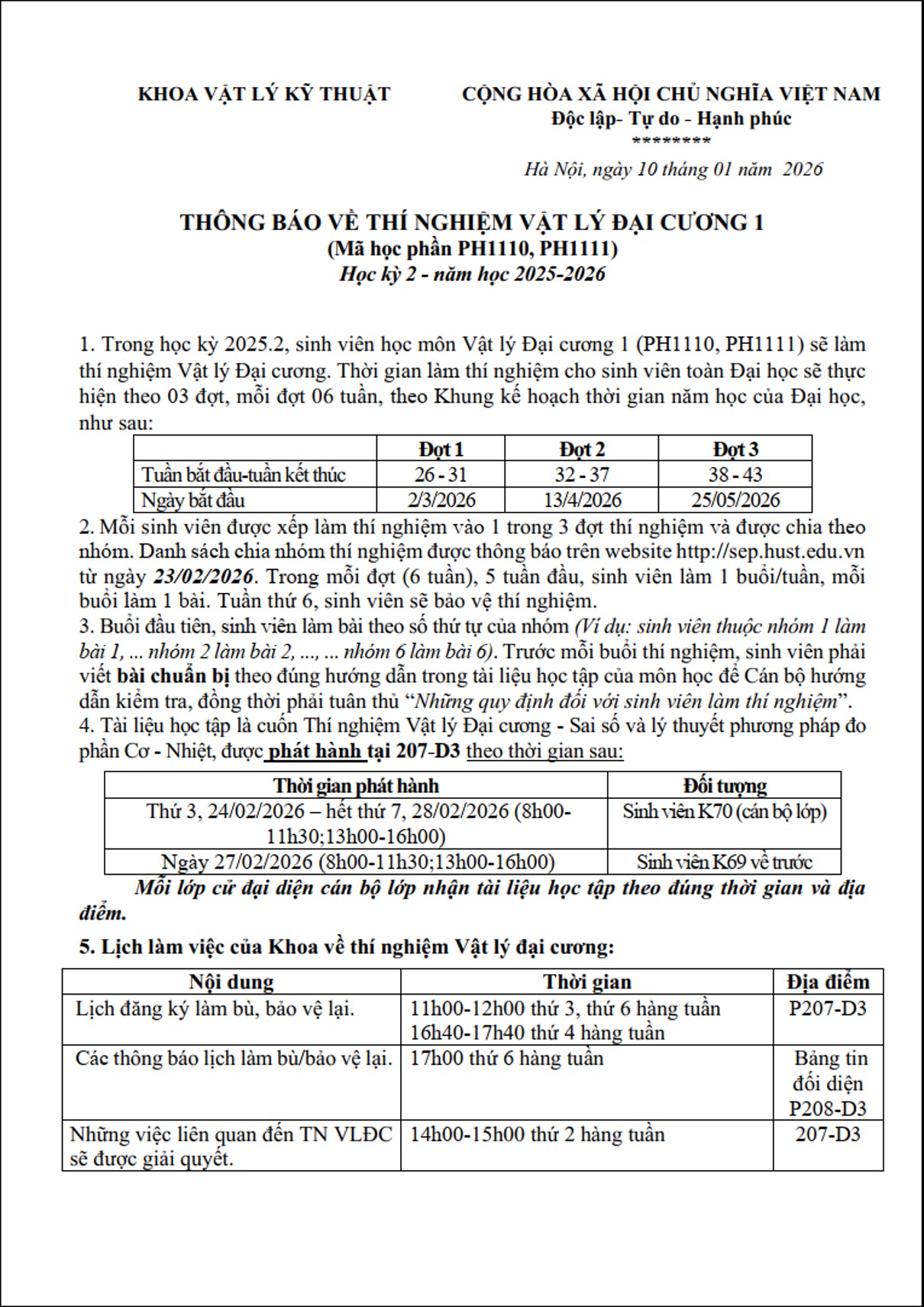 THÔNG BÁO VỀ THÍ NGHIỆM VẬT LÝ ĐẠI CƯƠNG 1 (Mã học phần PH1110, PH1111)