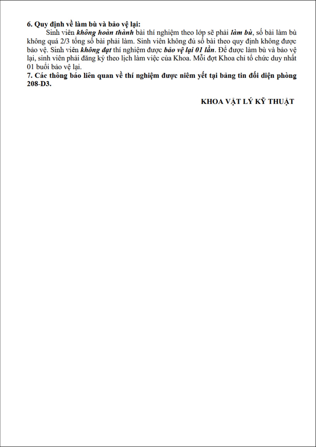 Khoa Vật lý Kỹ thuật xin thông báo về Thí nghiệm Vật lý Đại cương 1