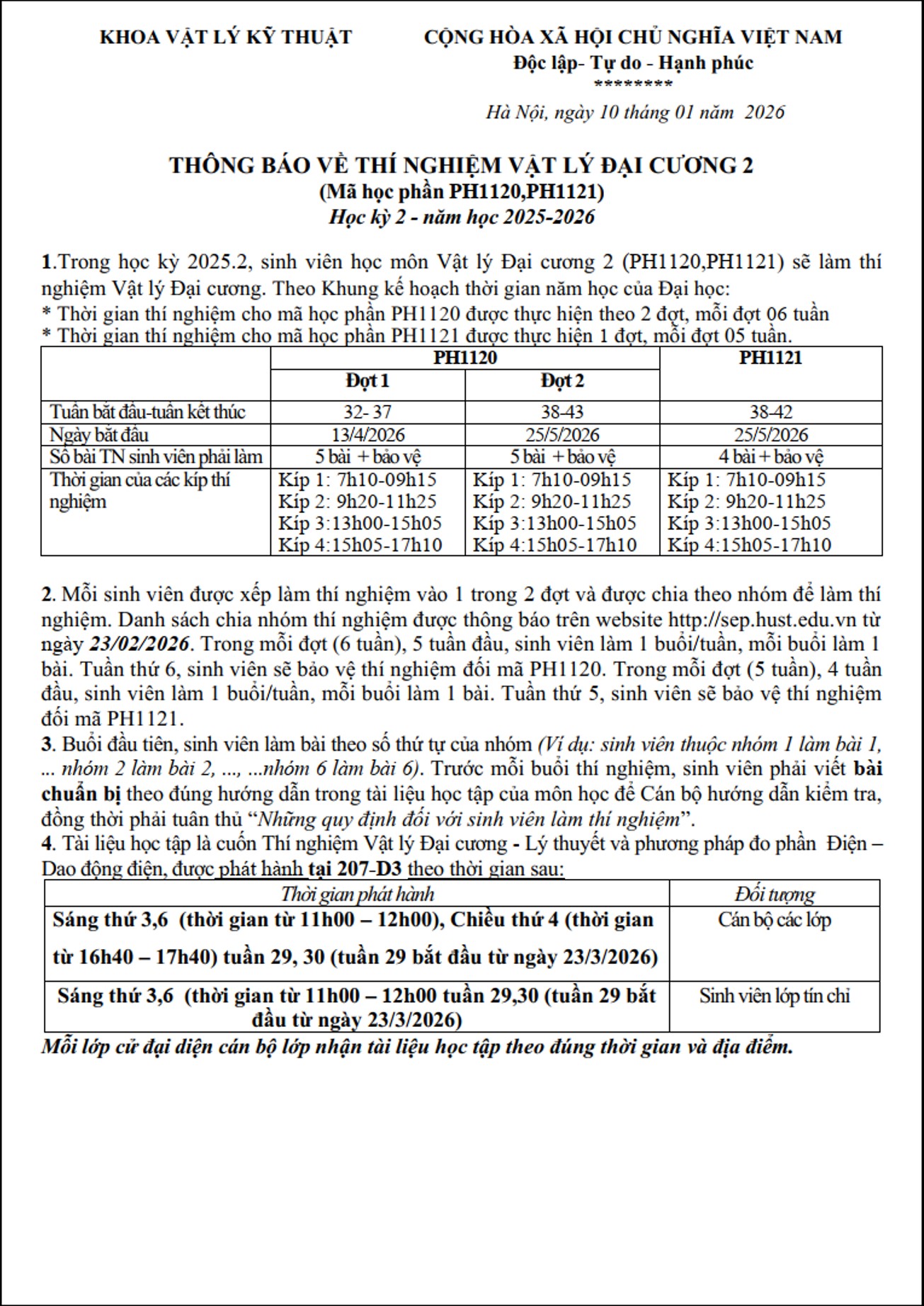 THÔNG BÁO VỀ THÍ NGHIỆM VẬT LÝ ĐẠI CƯƠNG 1 (Mã học phần PH1120, PH1121)