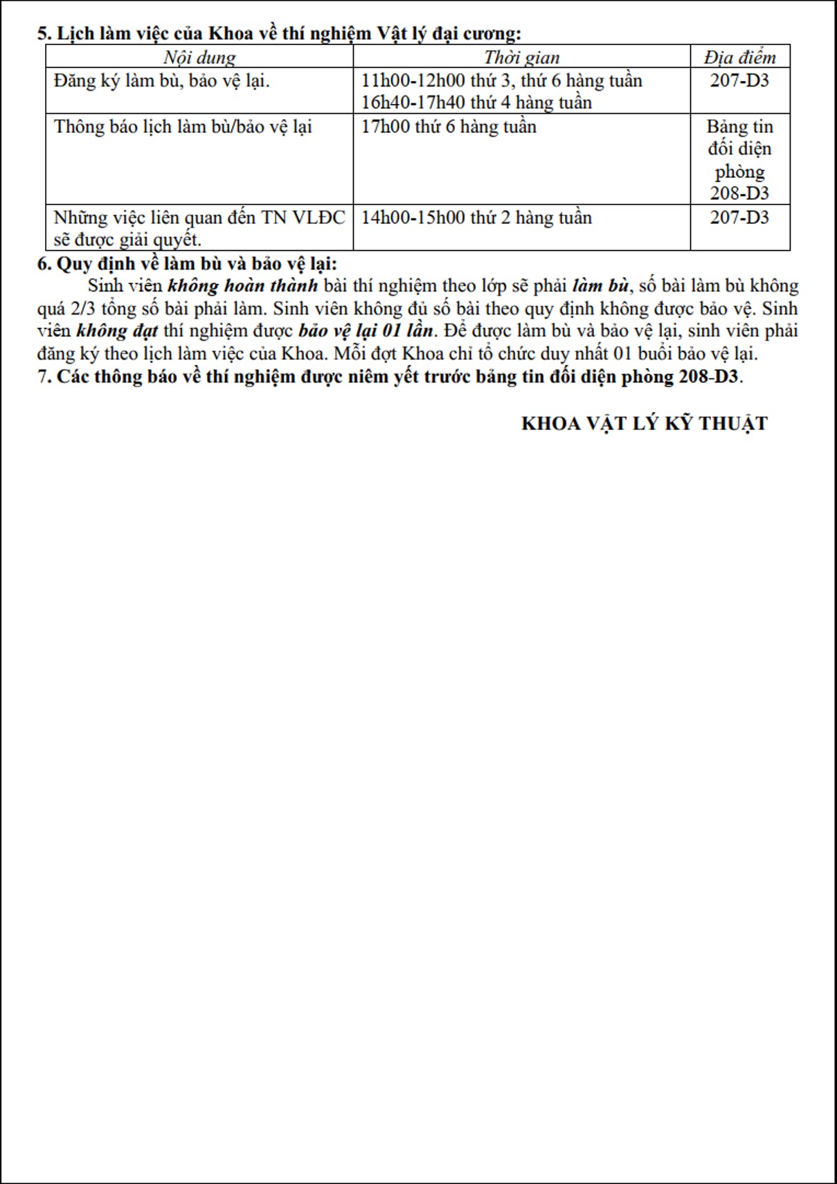 Khoa Vật lý Kỹ thuật xin thông báo về Thí nghiệm Vật lý Đại cương 1